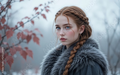 A digitally illustrated portrait of a woman with braided hair wearing a fur-collared coat in a wintery scene.