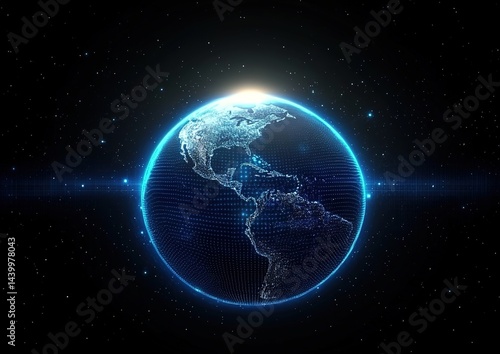 A digitally rendered Earth with a grid pattern and blue lights on edges against a starry background.