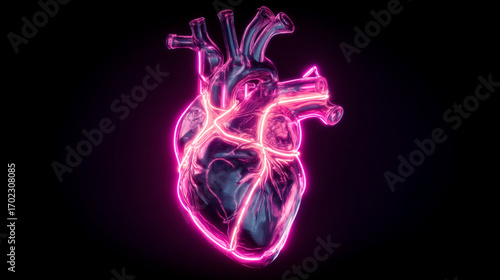 A digitally rendered heart with a chrome finish and pink neon outlining on a black background