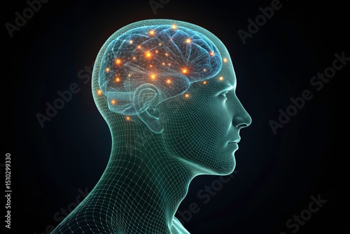 A digitally rendered human head in profile showcasing the brain with illuminated neural connections in a dark environment.