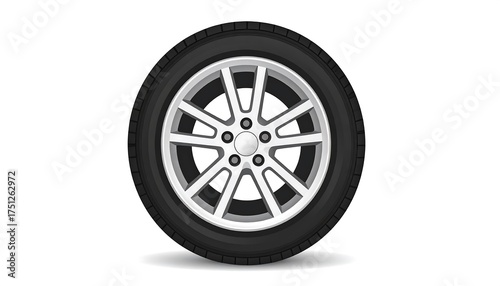 A digitally rendered illustration of a single car wheel, seen from the side. It has a dark tire, a silver rim with multiple spokes and a central hub