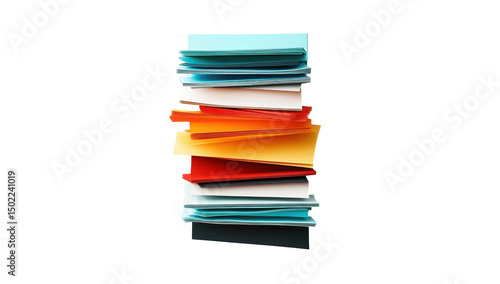 A digitally-rendered stack of papers, in various shades of blue, red, orange, and white, appearing slightly disheveled and leaning