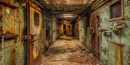 A dimly lit, abandoned corridor lined with rusty doors, evoking a sense of decay and neglect.