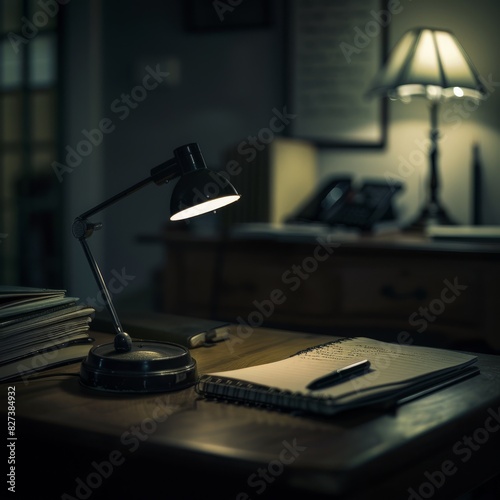A dimly lit desk featuring a focused lamp, an open notebook with a pen, and a stack of papers, creating an intimate and contemplative workspace.