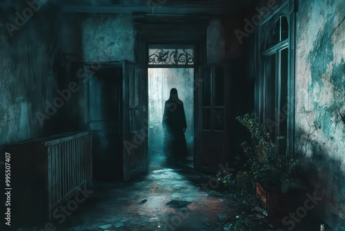A dimly lit hallway with a shadowy figure standing in a doorway, evoking a sense of mystery and eerie ambiance.