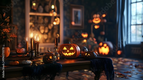 A dimly lit room decorated for Halloween with pumpkins, candles, and cobwebs on a table in front of a window.