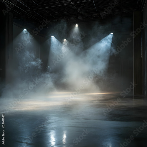 A dimly lit room with a concrete floor, filled with smoke and illuminated by soft spotlights