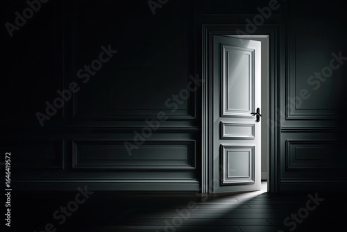 A dimly lit room with a doorway revealing a bright light source