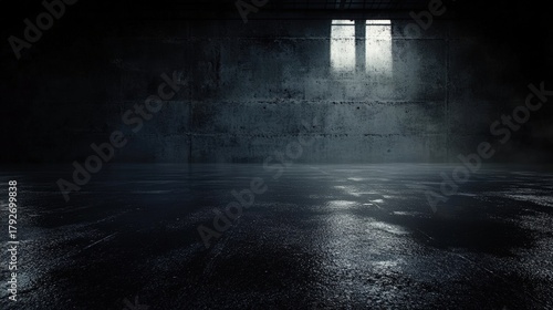 A dimly lit space with a glossy floor reflecting light, featuring rough, textured walls and a window casting shadows.
