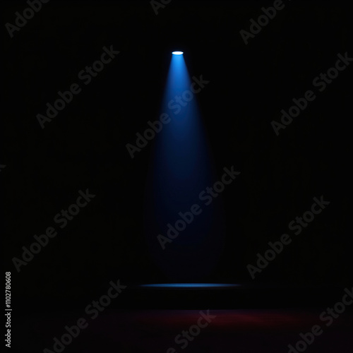 A dimly lit stage with a single blue spotlight shining down on it, casting an ominous glow on the surrounding area, eerie atmosphere, shadowy ambiance., darkened theater, dramatic lighting