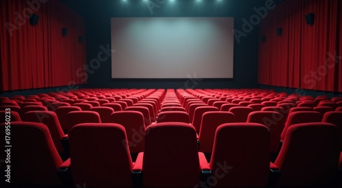 A dimly lit theater with red seats and a projector screen