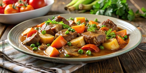 A diner plate with a savory beef stew and fresh vegetables arranged on it , heartydish, comfortfood, heartydish