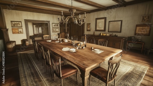A dining room setup with a long wooden table and matching chairs, perfect for family gatherings8