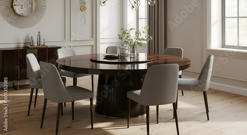 A dining room with a round table surrounded by chairs and a sideboard against the wall with decor