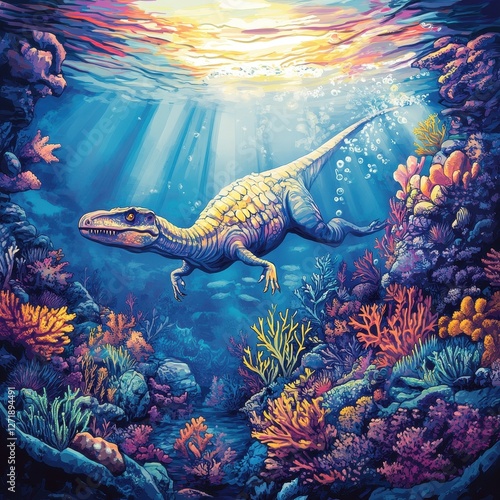 A dinosaur swims majestically through a vibrant underwater coral reef