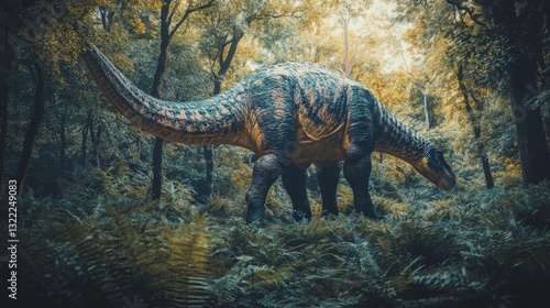 A dinosaur wanders through a lush, prehistoric forest, evoking an era long extinct with vibrant foliage.