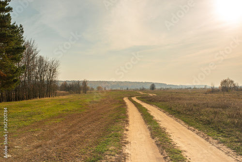 A dirt road runs through a field. Pine forest near the road