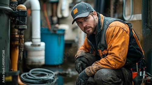 A Dirty, Gritty Worker Kneeling Near Industrial Equipment