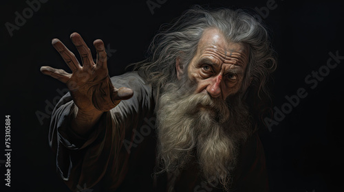 a dirty old man with long white hair and beard in the black shadow background with his hand wanting to reach. Generatvie AI