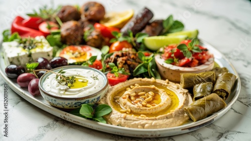 A dish of Greek meze with hummus seasoned with olive oil and pine nuts, creamy tzatziki, feta cheese with dried oregano and olive oil, kalamata olives, tomatoes, meatballs and tightly rolled rolls.