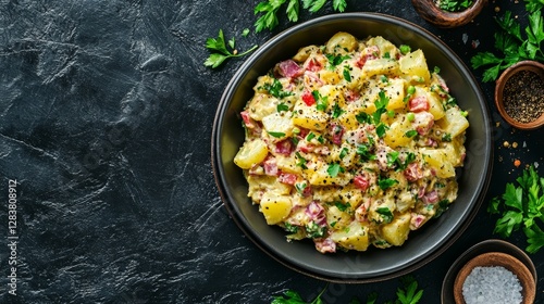 A Dish of Kartoffelsalat, a German Potato Salad Made with Mustard and Vinegar Dressing, Garnished with Fresh Parsley
