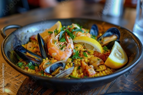 A dish of paella, a vibrant mix of saffron rice, shrimp, clams, mussels, and chorizo, garnished with lemon wedges and parsley.