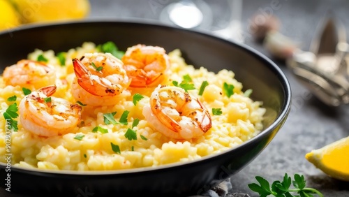 A dish with creamy risotto flavored with saffron, sprinkled with fatty shrimp and garnished with chopped parsley, lemon slices are served on the side.