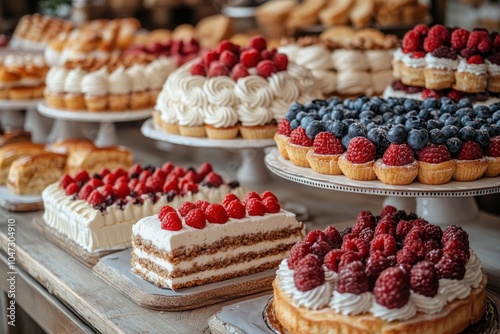 A display of various desserts featuring cakes and pastries topped with fresh fruits.
