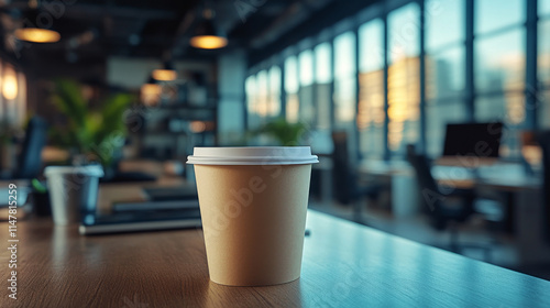 A disposable coffee cup sits on a table in a modern office space, bathed in soft, warm light. The blurred background suggests a busy workday.