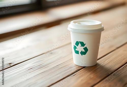 A disposable coffee cup with a green recycling symbol
