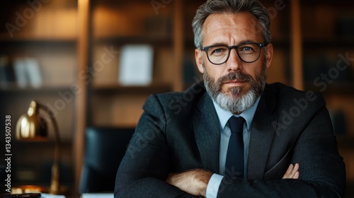 A distinguished businessman with a beard, sitting confidently in his executive office, showcasing a strong sense of authority and professionalism in a refined setting.
