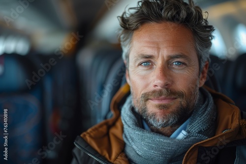 A distinguished mature man with blue eyes wearing a scarf and a winter coat in an aircraft cabin with seats
