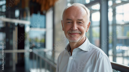 A distinguished older gentleman stands smiling in a bright, modern office, exuding warmth, experience, and a welcoming demeanor.