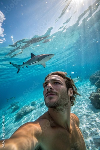 A diver underwater, surrounded by the majestic presence of a shark, capturing the thrill and beauty of ocean exploration and marine life