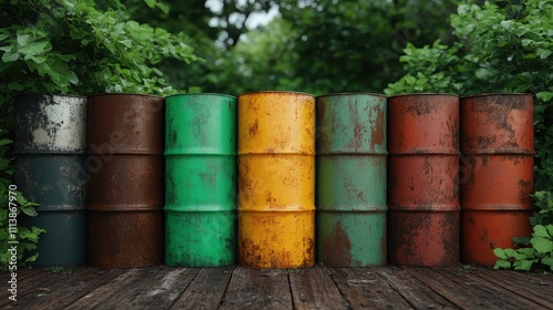 A diverse array of worn and rustic barrels stands in a natural setting, surrounded by lush green foliage, creating a striking juxtaposition of nature and industry.