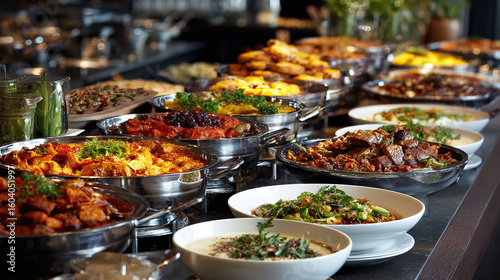 A diverse buffet featuring various food items in metal serving dishes and bowls, showcasing a wide array of culinary options.