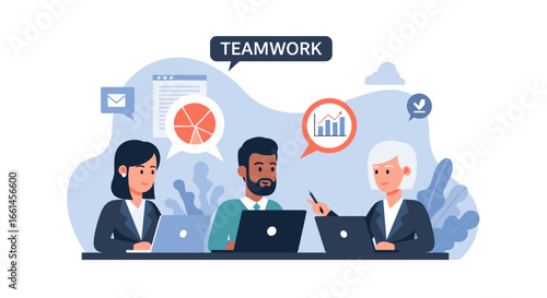 A diverse business team collaborates on laptops, symbolizing teamwork, strategy, and successful project management in a modern office environment.