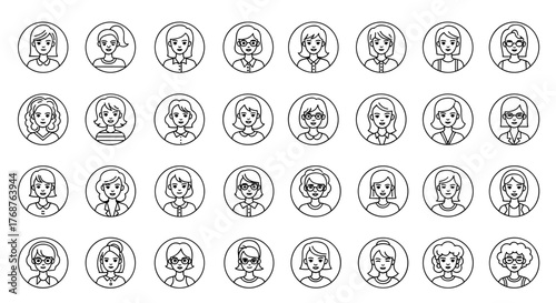 A diverse collection of 30 white line art avatar icons representing women of various ages and styles, set against a black background, perfect for user profiles, social media, and digital interfaces