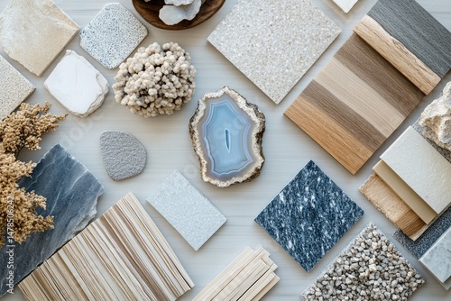 A diverse collection of natural and artificial surface materials including stones. tiles. and textures arranged aesthetically on a neutral background. ideal for design inspiration