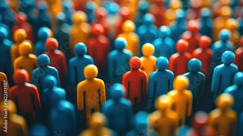 A diverse crowd of colorful figurines, each with unique facial expressions and body postures, standing in a vibrant, colorful setting with a blurred background.
