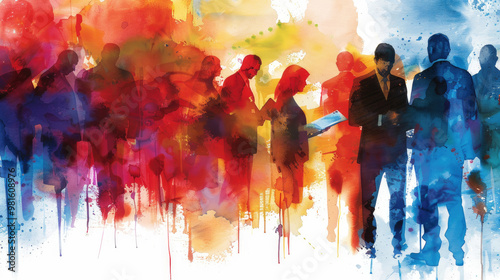 A diverse group converses and collaborates against a vibrant, abstract backdrop, embodying energy and innovation