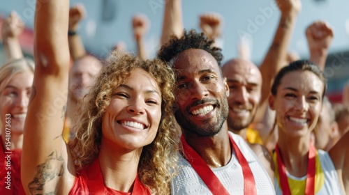A diverse group of athletes celebrating a victory with medals and raised arms, full of joy.