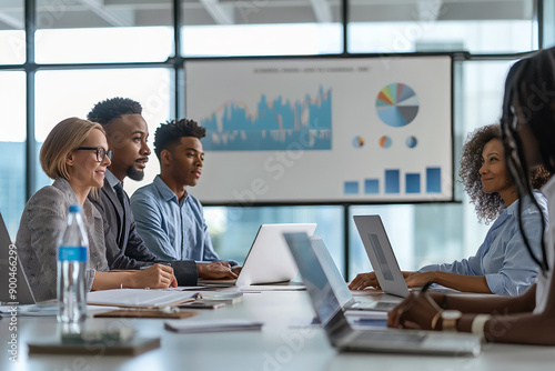 A diverse group of business professionals in a modern office, gathered around a conference table, discussing and collaborating with laptops, charts, and graphs in front of them.