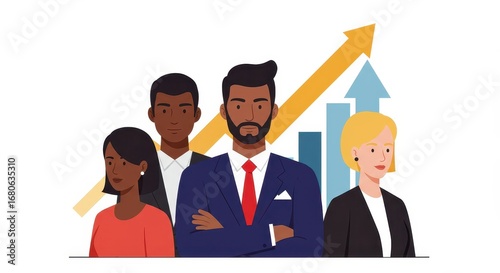 A diverse group of business professionals stands together, signifying teamwork and growth.