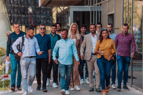 A diverse group of businessmen and colleagues walking together by their workplace, showcasing collaboration and teamwork in the company.