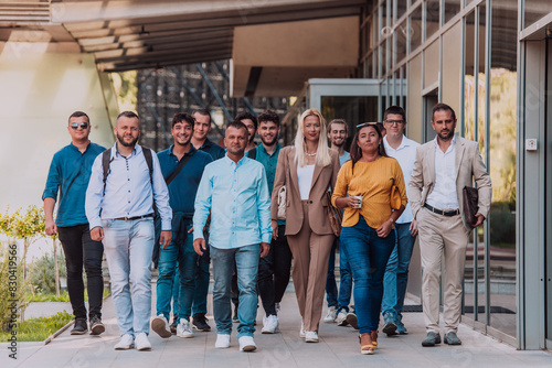 A diverse group of businessmen and colleagues walking together by their workplace, showcasing collaboration and teamwork in the company.