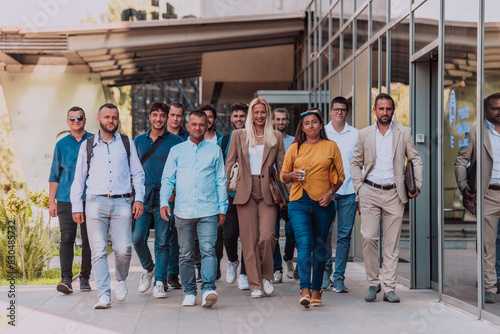 A diverse group of businessmen and colleagues walking together by their workplace, showcasing collaboration and teamwork in the company.