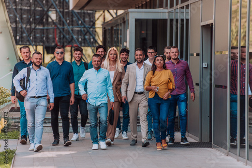 A diverse group of businessmen and colleagues walking together by their workplace, showcasing collaboration and teamwork in the company.