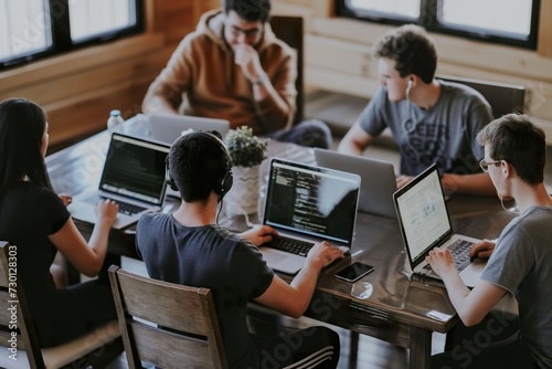 A diverse group of creative minds collaborating and working together, each engrossed in their laptops, harnessing the potential of technology.