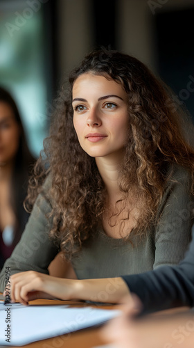 A diverse group of female colleagues working on a startup pitch presentation, discussing ideas around a conference table.